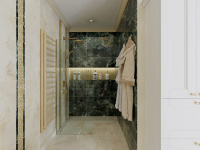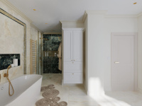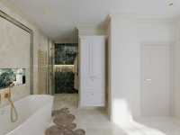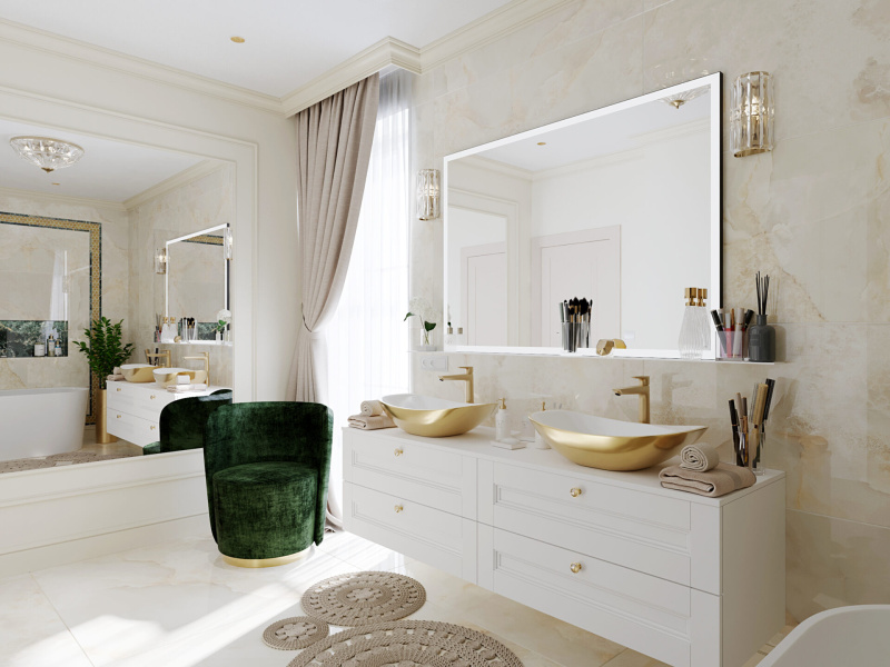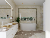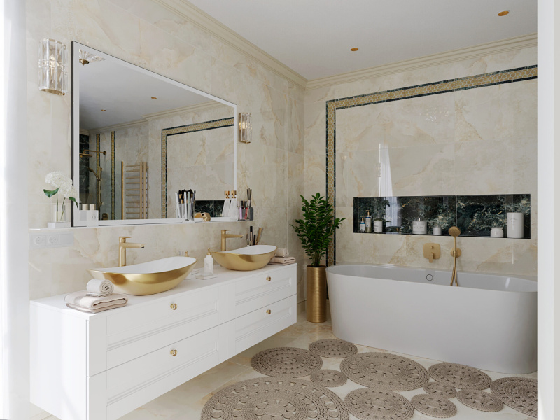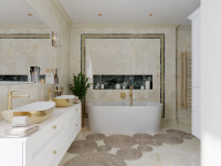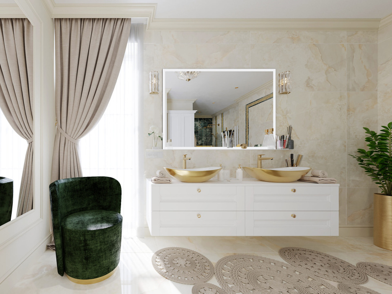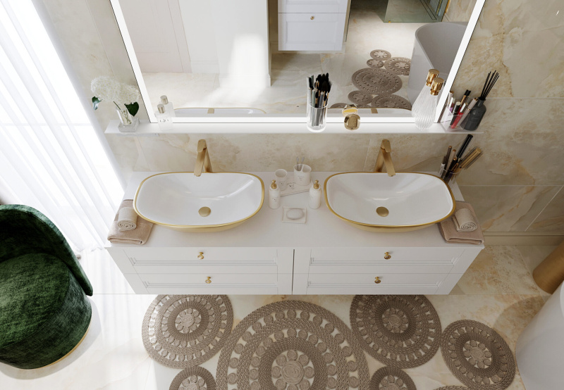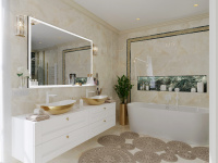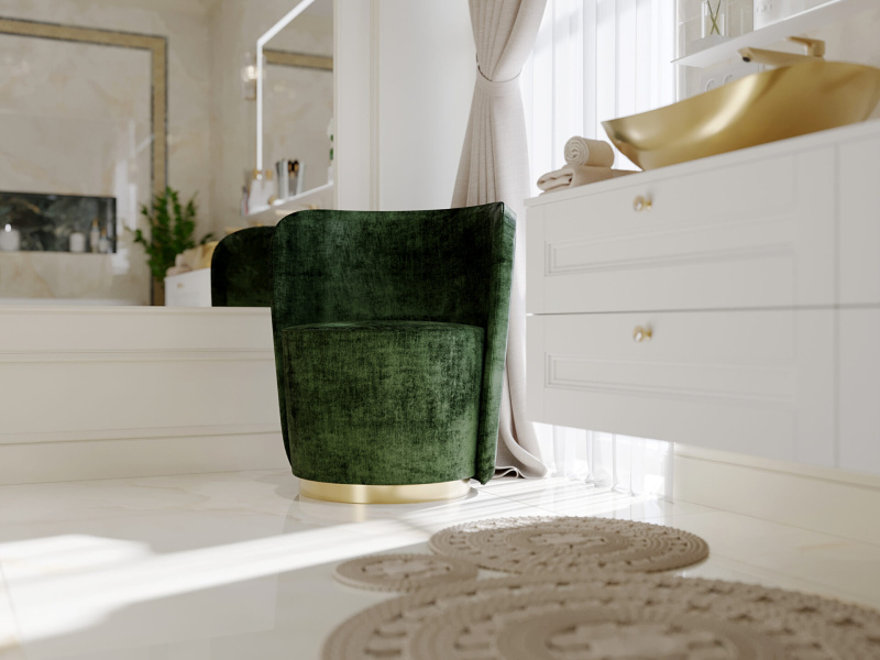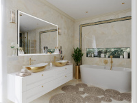 Všetky použité prvky – obklad, batérie, radiátor, nábytok, sanita, svietidlá a kreslo sú použité z našej ponuky, teda vizualizácia je riešená pre priamu realizáciu na kľúč.