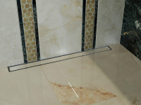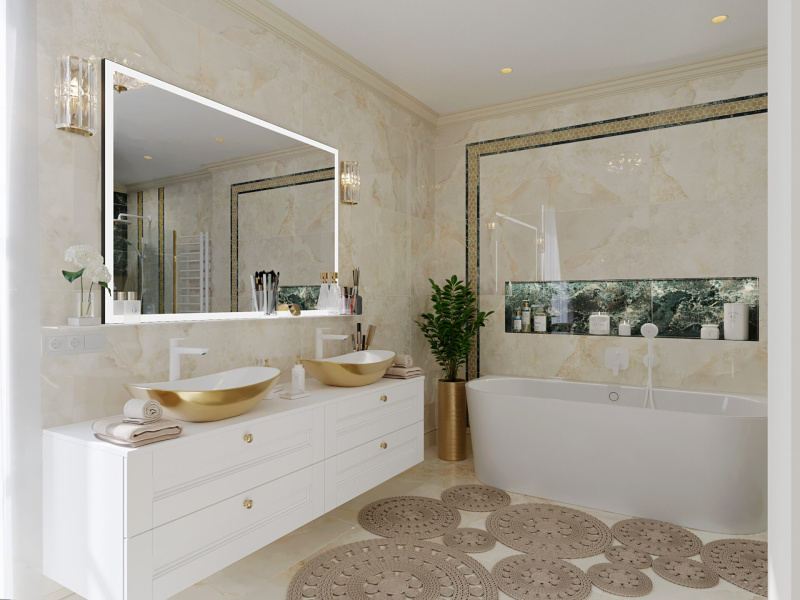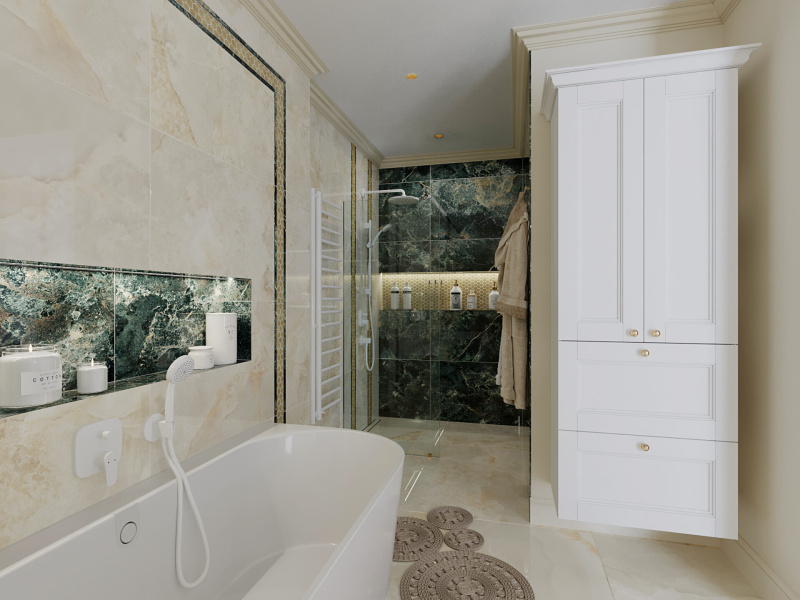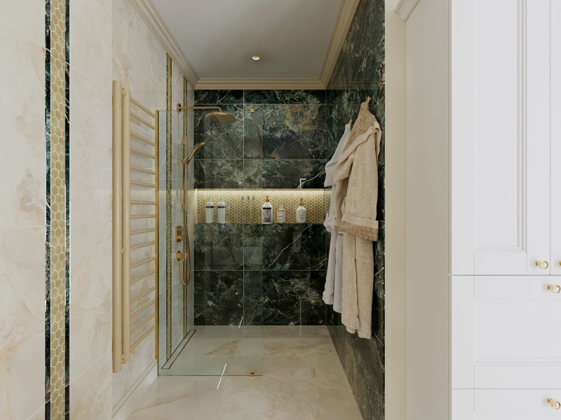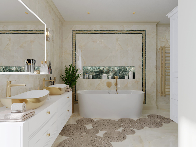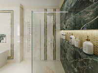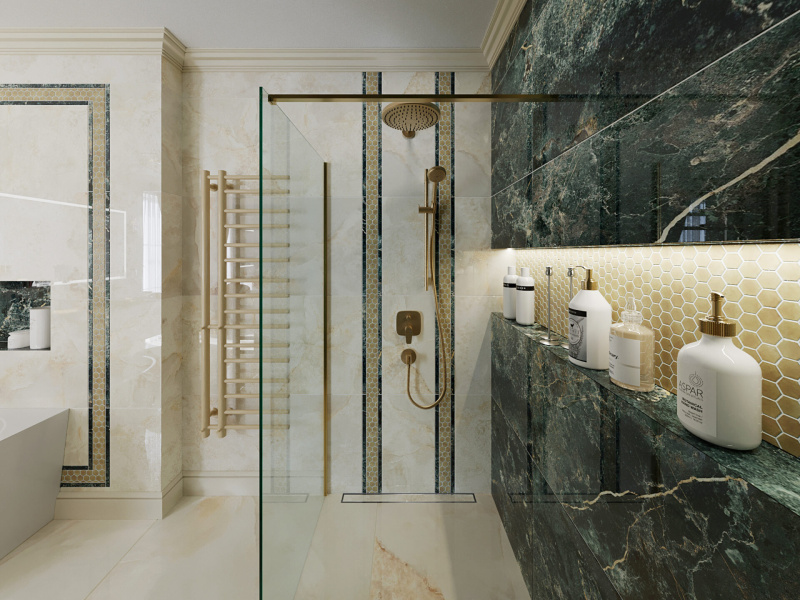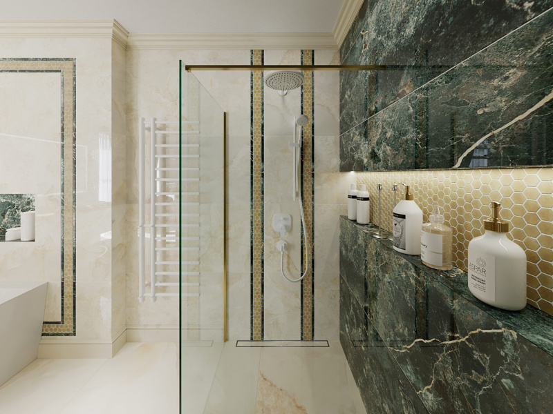 Kvalitné dizajnové obklady s jemným dekorom béžového a zeleného mramoru od nášho španielskeho dodávateľa sme dekorovali s malou mozaikou v kovovom prevedení.