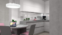 Interiér dvoj-izbového bytu v Bratislave sme pre klientku navrhli, urobili sme vizualizáciu a následne sme byt zariadili. Interiér bytu pre mladú energickú slečnu sme zariadili v modernom dizajne a jemných farbách šedej v kombinácií s požadovanou rúžovou farbou. Pre zariadenie kuchyne sme zvolili modernú kolekciu COLORS v bielej lesklej farbe v kombinácií so šedou betónovou povrchovou úpravou. Jedálenské stoličky od firmy NATISA z kolekcie MELODY v dvojfarebnej kombinácií – šedá s rúžovou pekne doladili jemný vzhľad interiéru. Spojený priestor kuchyne a obývačky musel farebne ladiť a tak sme zvolili nábytok z kolekcie ELITE v šedej lesklej farbe a doplnili sme ju pohodlnou sedacou súpravou talianskej výroby v šedej látke s odleskom. Koberec z kolekcie GABRIELLE nám celý priestor zjednotil a doplnil celkový vzhľad interiéru.